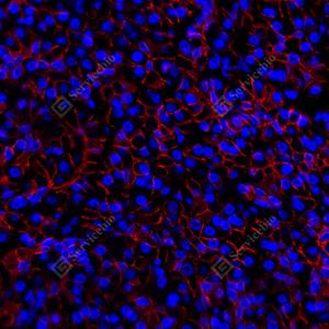| IF检测beta Catenin蛋白(货号 GB12016)(红色). 样品: 人胰腺, 4%多聚甲醛 (货号G1101) 固定12-24小时. 抗原修复: 柠檬酸抗原修复液(干粉, pH 6.0) (G1201), 高压锅均匀喷气计时2分钟. 封闭: 3% BSA(货号GC305010)的PBS溶液, 室温孵育30分钟. —抗: 1: 1000稀释, 4℃ 孵育过夜. 二抗: Cy3标记山羊抗小鼠IgG (H+L) (货号GB21301), 1: 300稀释, 室温孵育1小时. |