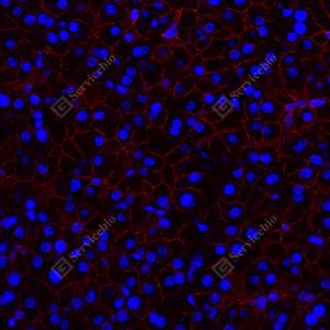 | IF检测beta Catenin蛋白(货号 GB12016)(红色). 样品: 小鼠胰腺, 4%多聚甲醛 (货号G1101) 固定12-24小时. 抗原修复: 柠檬酸抗原修复液(干粉, pH 6.0) (G1201), 高压锅均匀喷气计时2分钟. 封闭: 3% BSA(货号GC305010)的PBS溶液, 室温孵育30分钟. —抗: 1: 1000稀释, 4℃ 孵育过夜. 二抗: Cy3标记山羊抗小鼠IgG (H+L) (货号GB21301), 1: 300稀释, 室温孵育1小时. |