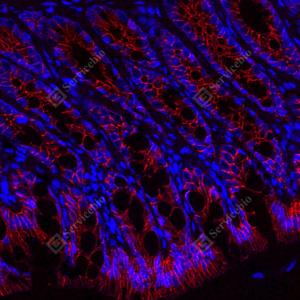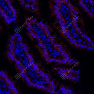 | IF检测beta Catenin蛋白(货号 GB12016)(红色). 样品: 小鼠小肠, 4%多聚甲醛 (货号G1101) 固定12-24小时. 抗原修复: 柠檬酸抗原修复液(干粉, pH 6.0) (G1201), 高压锅均匀喷气计时2分钟. 封闭: 3% BSA(货号GC305010)的PBS溶液, 室温孵育30分钟. —抗: 1: 1000稀释, 4℃ 孵育过夜. 二抗: Cy3标记山羊抗小鼠IgG (H+L) (货号GB21301), 1: 300稀释, 室温孵育1小时. |