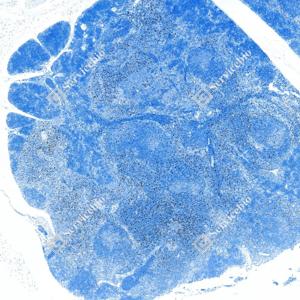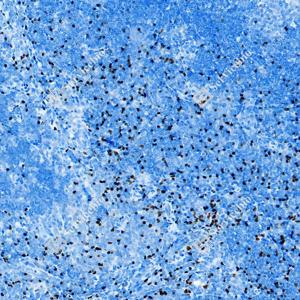 IHC检测FOXP3蛋白(货号 GB152325). 样品: 小鼠胸腺, 4%多聚甲醛 (货号G1101) 固定12-24小时. 抗原修复: 柠檬酸抗原修复液 (干粉, pH 6.0) (G1201), 高压锅均匀喷气计时2分钟. —抗: 1: 500稀释, 4℃ 孵育过夜. 二抗: S-vision免疫组化多聚二抗(山羊抗兔),即用型 (货号G1302), 室温孵育20分钟. |