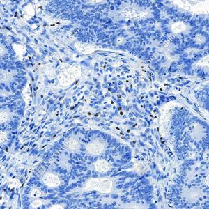 IHC检测 FOXP3蛋白(货号 GB152325). 样品: 人结肠癌, 4%多聚甲醛 (货号G1101) 固定12-24小时. 抗原修复: 柠檬酸抗原修复液 (干粉, pH 6.0) (G1201), 高压锅均匀喷气计时2分钟. —抗: 1: 1000稀释, 4℃ 孵育过夜. 二抗: S-vision免疫组化多聚二抗(山羊抗兔),即用型 (货号G1302), 室温孵育20分钟. |