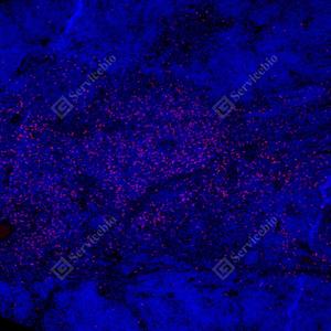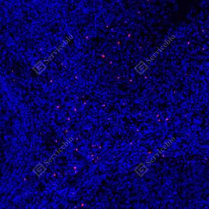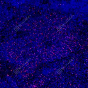 IF检测 FOXP3蛋白(货号 GB152325)(红色). 样品: 人扁桃体, 4%多聚甲醛 (货号G1101) 固定12-24小时. 抗原修复: 柠檬酸抗原修复液 (干粉, pH 6.0) (G1201), 高压锅均匀喷气计时2分钟. —抗: 1: 1000稀释, 4℃ 孵育过夜. 二抗: Cy3标记山羊抗兔IgG (H+L) (货号GB21303), 1: 300稀释, 室温孵育1小时. |