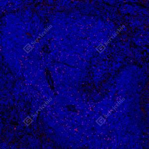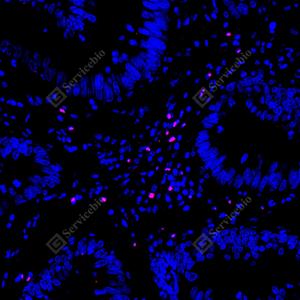 IF检测FOXP3蛋白(货号 GB152325)(红色). 样品: 人结肠癌, 4%多聚甲醛 (货号G1101) 固定12-24小时. 抗原修复: 柠檬酸抗原修复液 (干粉, pH 6.0) (G1201), 高压锅均匀喷气计时2分钟. —抗: 1: 1000稀释, 4℃ 孵育过夜. 二抗: Cy3标记山羊抗兔IgG (H+L) (货号GB21303), 1: 300稀释, 室温孵育1小时. |