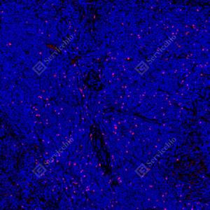 IF检测FOXP3蛋白(货号 GB152325)(红色). 样品: 小鼠胸腺, 4%多聚甲醛 (货号G1101) 固定12-24小时. 抗原修复: 柠檬酸抗原修复液 (干粉, pH 6.0) (G1201), 高压锅均匀喷气计时2分钟. —抗: 1: 1000稀释, 4℃ 孵育过夜. 二抗: Cy3标记山羊抗兔IgG (H+L) (货号GB21303), 1: 300稀释, 室温孵育1小时. |