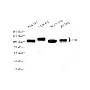 WB检测CD34蛋白(货号 GB15013). 样品: 经RIPA裂解液(货号G2002)处理的蛋白质. 封闭: 3%脱脂牛奶(货号GC310001)溶于TBST溶液, 室温孵育1小时. —抗: 1: 500稀释, 4℃ 孵育过夜. 二抗: HRP标记山羊抗兔IgG (H+L) (货号GB23303), 1: 5000稀释, 室温孵育1小时. |