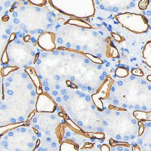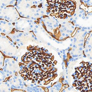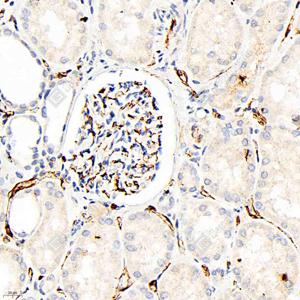 IHC检测CD34蛋白(货号 GB15013). 样品: 人肾, 4%多聚甲醛 (货号G1101) 固定12-24小时. 抗原修复: 柠檬酸抗原修复液(干粉, pH 6.0) (G1201), 高压锅均匀喷气计时2分钟. —抗: 1: 500稀释, 4℃ 孵育过夜. 二抗: HRP标记山羊抗兔IgG (H+L) (货号GB23303), 1: 200稀释, 室温孵育1小时. |