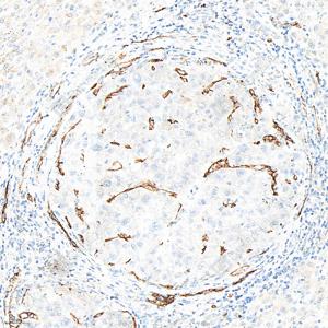 IHC检测CD34蛋白(货号 GB15013). 样品: 人肝癌, 4%多聚甲醛 (货号G1101) 固定12-24小时. 抗原修复: 柠檬酸抗原修复液(干粉, pH 6.0) (G1201), 高压锅均匀喷气计时2分钟. —抗: 1: 500稀释, 4℃ 孵育过夜. 二抗: HRP标记山羊抗兔IgG (H+L) (货号GB23303), 1: 200稀释, 室温孵育1小时. |