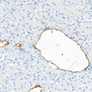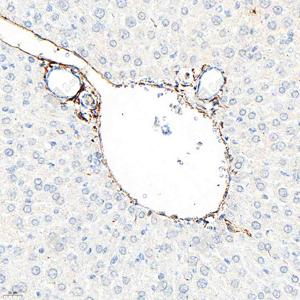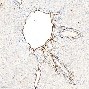 IHC检测CD34蛋白(货号 GB15013). 样品: 小鼠肝, 4%多聚甲醛 (货号G1101) 固定12-24小时. 抗原修复: 柠檬酸抗原修复液(干粉, pH 6.0) (G1201), 高压锅均匀喷气计时2分钟. —抗: 1: 500稀释, 4℃ 孵育过夜. 二抗: HRP标记山羊抗兔IgG (H+L) (货号GB23303), 1: 200稀释, 室温孵育1小时. |
