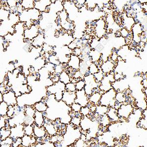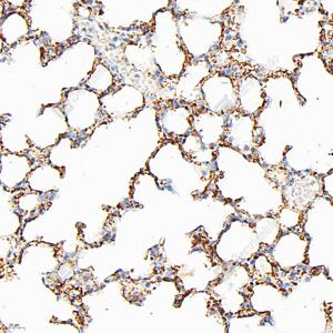 IHC检测CD34蛋白(货号 GB15013). 样品: 大鼠肺, 4%多聚甲醛 (货号G1101) 固定12-24小时. 抗原修复: 柠檬酸抗原修复液(干粉, pH 6.0) (G1201), 高压锅均匀喷气计时2分钟. —抗: 1: 500稀释, 4℃ 孵育过夜. 二抗: HRP标记山羊抗兔IgG (H+L) (货号GB23303), 1: 200稀释, 室温孵育1小时. |