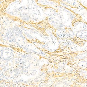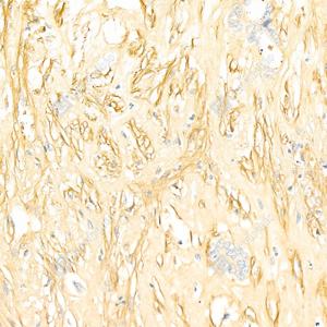 IHC检测Fibronectin蛋白(货号 GB12091). 样品: 人胃癌, 4%多聚甲醛 (货号G1101) 固定12-24小时. 抗原修复: 蛋白酶K(G1234)(200微克/毫升)在55℃条件下用于抗原修复20分钟. —抗: 1: 200稀释, 4℃ 孵育过夜. 二抗: HRP标记山羊抗小鼠IgG (H+L) (货号GB23301), 1: 200稀释, 室温孵育1小时. |