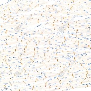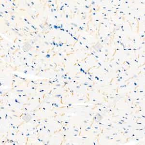 IHC检测N Cadherin蛋白(货号 GB111273). 样品: 小鼠心, 4%多聚甲醛 (货号G1101) 固定12-24小时. 抗原修复: 柠檬酸抗原修复液(干粉, pH 6.0) (G1201), 98℃, 20分钟. —抗: 1: 1500稀释, 4℃ 孵育过夜. 二抗: HRP标记山羊抗兔IgG (H+L) (货号GB23303), 1: 200稀释, 室温孵育1小时. |