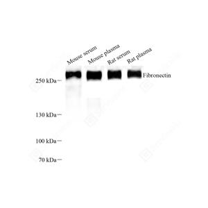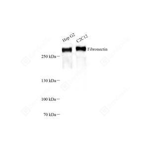 WB检测Fibronectin蛋白(货号 GB114491). 样品: 经RIPA裂解液(货号G2002)处理的蛋白质. 封闭: 3%脱脂牛奶(货号GC310001)溶于TBST溶液, 室温孵育1小时. —抗: 1: 500稀释, 4℃ 孵育过夜. 二抗: HRP标记山羊抗兔IgG (H+L) (货号GB23303), 1: 5000稀释, 室温孵育1小时. |
