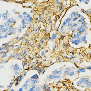 IHC检测Fibronectin蛋白(货号 GB114491). 样品: 人卵巢癌, 4%多聚甲醛 (货号G1101) 固定12-24小时. 抗原修复: 柠檬酸抗原修复液(干粉, pH 6.0) (G1201), 98℃, 20分钟. —抗: 1: 1500稀释, 4℃ 孵育过夜. 二抗: HRP标记山羊抗兔IgG (H+L) (货号GB23303), 1: 200稀释, 室温孵育1小时. |