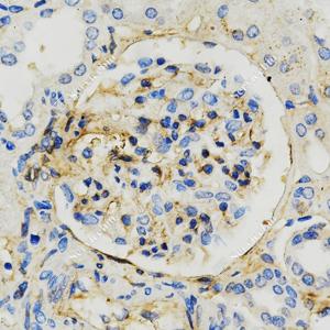 IHC检测Fibronectin蛋白(货号 GB114491). 样品: 人肾, 4%多聚甲醛 (货号G1101) 固定12-24小时. 抗原修复: 柠檬酸抗原修复液(干粉, pH 6.0) (G1201), 98℃, 20分钟. —抗: 1: 1500稀释, 4℃ 孵育过夜. 二抗: HRP标记山羊抗兔IgG (H+L) (货号GB23303), 1: 200稀释, 室温孵育1小时. |