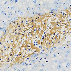IHC检测Fibronectin蛋白(货号 GB114491). 样品: 大鼠纤维化肝脏, 4%多聚甲醛 (货号G1101) 固定12-24小时. 抗原修复: 柠檬酸抗原修复液(干粉, pH 6.0) (G1201), 98℃, 20分钟. —抗: 1: 1500稀释, 4℃ 孵育过夜. 二抗: HRP标记山羊抗兔IgG (H+L) (货号GB23303), 1: 200稀释, 室温孵育1小时. |