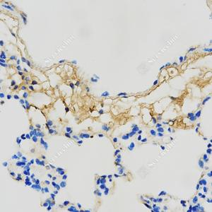 IHC检测Fibronectin蛋白(货号 GB114491). 样品: 大鼠肺, 4%多聚甲醛 (货号G1101) 固定12-24小时. 抗原修复: 柠檬酸抗原修复液(干粉, pH 6.0) (G1201), 98℃, 20分钟. —抗: 1: 1500稀释, 4℃ 孵育过夜. 二抗: HRP标记山羊抗兔IgG (H+L) (货号GB23303), 1: 200稀释, 室温孵育1小时. |
