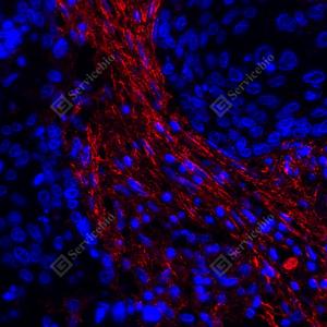 IF检测Fibronectin蛋白(货号 GB114491)(红色). 样品: 人宫颈癌, 4%多聚甲醛 (货号G1101) 固定12-24小时. 抗原修复: Tris-EDTA抗原修复液(pH 9.0) (G1203), 98℃, 20分钟. 封闭: 3% BSA(货号GC305010)的PBS溶液, 室温孵育30分钟. —抗: 1: 1500稀释, 4℃ 孵育过夜. 二抗: Cy3标记山羊抗兔IgG (H+L) (货号GB21303), 1: 300稀释, 室温孵育1小时. |