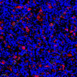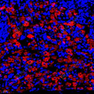 | IF检测Heme Oxygenase 1蛋白(货号 GB11549)(红色). 样品: 大鼠脾, 4%多聚甲醛 (货号G1101) 固定12-24小时. 抗原修复: Tris-EDTA抗原修复液(pH 9.0) (G1203), 98℃, 20分钟. 封闭: 3% BSA(货号GC305010)的PBS溶液, 室温孵育30分钟. —抗: 1: 600稀释, 4℃ 孵育过夜. 二抗: Cy3标记山羊抗兔IgG (H+L) (货号GB21303), 1: 300稀释, 室温孵育1小时. |