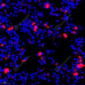 | IF检测Heme Oxygenase 1蛋白(货号 GB11549)(红色). 样品: 小鼠脾, 4%多聚甲醛 (货号G1101) 固定12-24小时. 抗原修复: Tris-EDTA抗原修复液(pH 9.0) (G1203), 98℃, 20分钟. 封闭: 3% BSA(货号GC305010)的PBS溶液, 室温孵育30分钟. —抗: 1: 600稀释, 4℃ 孵育过夜. 二抗: Cy3标记山羊抗兔IgG (H+L) (货号GB21303), 1: 300稀释, 室温孵育1小时. |