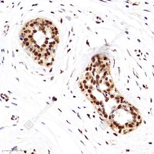 | IHC检测HMGB1蛋白(货号 GB11103). 样品: 人乳腺癌, 4%多聚甲醛 (货号G1101) 固定12-24小时. 抗原修复: 柠檬酸抗原修复液(干粉, pH 6.0) (G1201), 98℃, 20分钟. —抗: 1: 3000稀释, 4℃ 孵育过夜. 二抗: HRP标记山羊抗兔IgG (H+L) (货号GB23303), 1: 200稀释, 室温孵育1小时. |