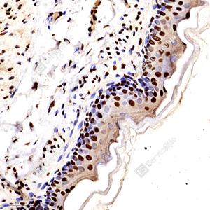 | IHC检测HMGB1蛋白(货号 GB11103). 样品: 大鼠皮肤, 4%多聚甲醛 (货号G1101) 固定12-24小时. 抗原修复: 柠檬酸抗原修复液(干粉, pH 6.0) (G1201), 98℃, 20分钟. —抗: 1: 2000稀释, 4℃ 孵育过夜. 二抗: HRP标记山羊抗兔IgG (H+L) (货号GB23303), 1: 200稀释, 室温孵育1小时. |