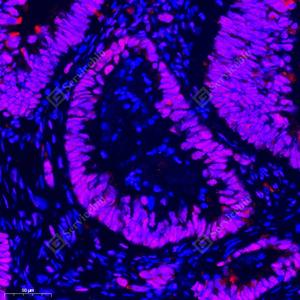| IF检测HMGB1蛋白(货号 GB11103)(红色). 样品: 人结直肠腺癌, 4%多聚甲醛 (货号G1101) 固定12-24小时. 抗原修复: Tris-EDTA抗原修复液(pH 9.0) (G1203), 98℃, 20分钟. 封闭: 3% BSA(货号GC305010)的PBS溶液, 室温孵育30分钟. —抗: 1: 1000稀释, 4℃ 孵育过夜. 二抗: Cy3标记山羊抗兔IgG (H+L) (货号GB21303), 1: 300稀释, 室温孵育1小时. |