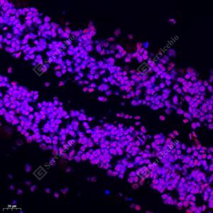 | IF检测HMGB1蛋白(货号 GB11103)(红色). 样品: 小鼠小脑, 4%多聚甲醛 (货号G1101) 固定12-24小时. 抗原修复: Tris-EDTA抗原修复液(pH 9.0) (G1203), 98℃, 20分钟. 封闭: 3% BSA(货号GC305010)的PBS溶液, 室温孵育30分钟. —抗: 1: 1000稀释, 4℃ 孵育过夜. 二抗: Cy3标记山羊抗兔IgG (H+L) (货号GB21303), 1: 300稀释, 室温孵育1小时. |