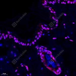 | IF检测HMGB1蛋白(货号 GB11103)(红色). 样品: 大鼠皮肤, 4%多聚甲醛 (货号G1101) 固定12-24小时. 抗原修复: Tris-EDTA抗原修复液(pH 9.0) (G1203), 98℃, 20分钟. 封闭: 3% BSA(货号GC305010)的PBS溶液, 室温孵育30分钟. —抗: 1: 1000稀释, 4℃ 孵育过夜. 二抗: Cy3标记山羊抗兔IgG (H+L) (货号GB21303), 1: 300稀释, 室温孵育1小时. |