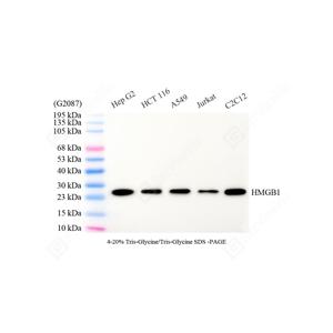 | WB检测HMGB1蛋白(货号 GB15103). 样品: 经RIPA裂解液(货号G2002)处理的蛋白质. 封闭: 3%脱脂牛奶(货号GC310001)溶于TBST溶液, 室温孵育1小时. —抗: 1: 1000稀释, 4℃ 孵育过夜. 二抗: HRP标记山羊抗兔IgG (H+L) (货号GB23303), 1: 5000稀释, 室温孵育1小时. |