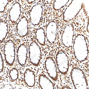 | IHC检测HMGB1蛋白(货号 GB15103). 样品: 人结肠, 4%多聚甲醛 (货号G1101) 固定12-24小时. 抗原修复: Tris-EDTA抗原修复液(pH 9.0) (G1203), 100℃, 25分钟. —抗: 1: 2000稀释, 4℃ 孵育过夜. 二抗: S-vision免疫组化多聚二抗(山羊抗兔),即用型 (货号G1302), 室温孵育20分钟. |