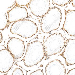 | IHC检测HMGB1蛋白(货号 GB15103). 样品: 大鼠睾丸, 4%多聚甲醛 (货号G1101) 固定12-24小时. 抗原修复: Tris-EDTA抗原修复液(pH 9.0) (G1203), 100℃, 25分钟. —抗: 1: 2000稀释, 4℃ 孵育过夜. 二抗: S-vision免疫组化多聚二抗(山羊抗兔),即用型 (货号G1302), 室温孵育20分钟. |