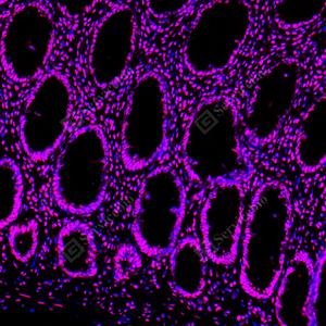 | IF检测HMGB1蛋白(货号 GB15103)(红色). 样品: 人结肠, 4%多聚甲醛 (货号G1101) 固定12-24小时. 抗原修复: Tris-EDTA抗原修复液(pH 9.0) (G1203), 100℃, 25分钟. 封闭: 3% BSA(货号GC305010)的PBS溶液, 室温孵育30分钟. —抗: 1: 2000稀释, 4℃ 孵育过夜. 二抗: Cy3标记山羊抗兔IgG (H+L) (货号GB21303), 1: 300稀释, 室温孵育1小时. |