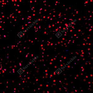 | IF检测HMGB1蛋白(货号 GB15103)(红色). 样品: 大鼠睾丸, 4%多聚甲醛 (货号G1101) 固定12-24小时. 抗原修复: Tris-EDTA抗原修复液(pH 9.0) (G1203), 100℃, 25分钟. 封闭: 3% BSA(货号GC305010)的PBS溶液, 室温孵育30分钟. —抗: 1: 2000稀释, 4℃ 孵育过夜. 二抗: Cy3标记山羊抗兔IgG (H+L) (货号GB21303), 1: 300稀释, 室温孵育1小时. |