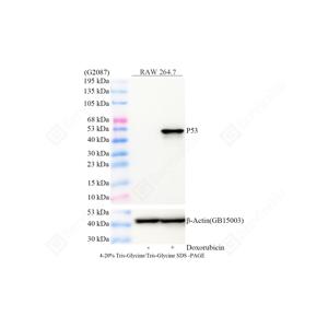 | WB检测p53蛋白(货号 GB155747). 样品: 经RIPA裂解液(货号G2002)处理的蛋白质. 封闭: 3%脱脂牛奶(货号GC310001)溶于TBST溶液, 室温孵育1小时. —抗: 1: 300稀释, 4℃ 孵育过夜. 二抗: HRP标记山羊抗兔IgG (H+L) (货号GB23303), 1: 5000稀释, 室温孵育1小时. |