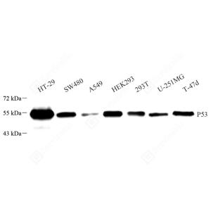 | WB检测P53蛋白(货号 GB12626). 样品: 经RIPA裂解液(货号G2002)处理的蛋白质. 封闭: 3%脱脂牛奶(货号GC310001)溶于TBST溶液, 室温孵育1小时. —抗: 1: 1000稀释, 4℃ 孵育过夜. 二抗: HRP标记山羊抗小鼠IgG (H+L) (货号GB23301), 1: 5000稀释, 室温孵育1小时. |