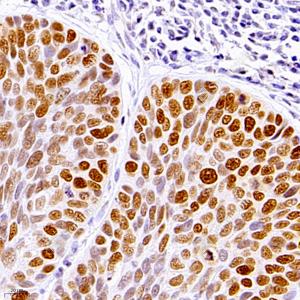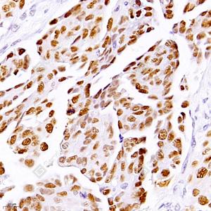 | IHC检测P53蛋白(货号 GB12626). 样品: 人卵巢癌, 4%多聚甲醛 (货号G1101) 固定12-24小时. 抗原修复: 柠檬酸抗原修复液(干粉, pH 6.0) (G1201), 高压锅均匀喷气计时2分钟. —抗: 1: 1000稀释, 4℃ 孵育过夜. 二抗: HRP标记山羊抗小鼠IgG (H+L) (货号GB23301), 1: 200稀释, 室温孵育1小时. |