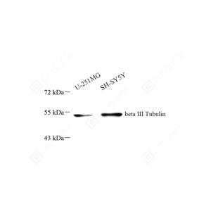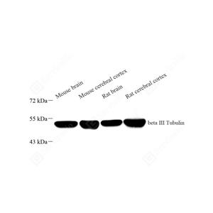 | WB检测beta III Tubulin蛋白(货号 GB15139). 样品: 经RIPA裂解液(货号G2002)处理的蛋白质. 封闭: 3%脱脂牛奶(货号GC310001)溶于TBST溶液, 室温孵育1小时. —抗: 1: 1000稀释, 4℃ 孵育过夜. 二抗: HRP标记山羊抗小鼠IgG (H+L) (货号GB23301), 1: 5000稀释, 室温孵育1小时. |