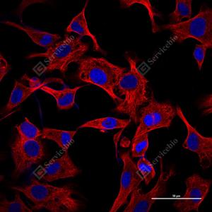 ICC检测alpha Tubulin蛋白(货号 GB15201)(红色). 样品: HeLa细胞, 4%多聚甲醛 (货号G1101) 固定20分钟. 封闭: 3% BSA(货号GC305010)的PBS溶液, 室温孵育30分钟. 一抗: 1: 1000稀释, 4℃ 孵育过夜. 二抗: Cy3标记山羊抗兔IgG (H+L) (货号GB21303), 1: 300稀释, 室温孵育1小时. |