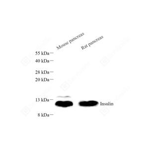 WB检测Insulin蛋白(货号 GB15334). 样品: 经RIPA裂解液(货号G2002)处理的蛋白质. 封闭: 3%脱脂牛奶(货号GC310001)溶于TBST溶液, 室温孵育1小时. —抗: 1: 300稀释, 4℃ 孵育过夜. 二抗: HRP标记山羊抗小鼠IgG (H+L) (货号GB23301), 1: 5000稀释, 室温孵育1小时. |