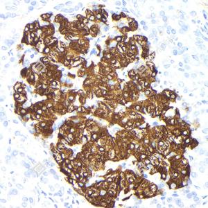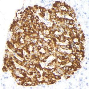 IHC检测Insulin蛋白(货号 GB15334). 样品: 人胰腺, 4%多聚甲醛 (货号G1101) 固定12-24小时. 抗原修复: 柠檬酸抗原修复液(干粉, pH 6.0) (G1201), 高压锅均匀喷气计时2分钟. —抗: 1: 1000稀释, 4℃ 孵育过夜. 二抗: HRP标记山羊抗小鼠IgG (H+L) (货号GB23301), 1: 200稀释, 室温孵育1小时. |