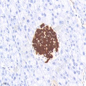 IHC检测Insulin蛋白(货号 GB15334). 样品: 小鼠胰腺, 4%多聚甲醛 (货号G1101) 固定12-24小时. 抗原修复: 柠檬酸抗原修复液(干粉, pH 6.0) (G1201), 高压锅均匀喷气计时2分钟. —抗: 1: 1000稀释, 4℃ 孵育过夜. 二抗: HRP标记山羊抗小鼠IgG (H+L) (货号GB23301), 1: 200稀释, 室温孵育1小时. |