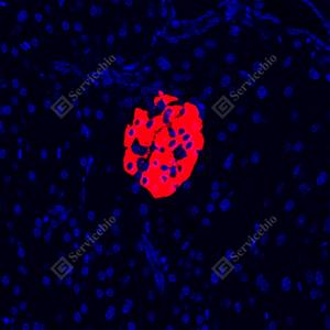 IF检测Insulin蛋白(货号 GB15334)(红色). 样品: 小鼠胰腺, 4%多聚甲醛 (货号G1101) 固定12-24小时. 抗原修复: 柠檬酸抗原修复液(干粉, pH 6.0) (G1201), 高压锅均匀喷气计时2分钟. 封闭: 3% BSA(货号GC305010)的PBS溶液, 室温孵育30分钟. —抗: 1: 500稀释, 4℃ 孵育过夜. 二抗: Cy3标记山羊抗小鼠IgG (H+L) (货号GB21301), 1: 300稀释, 室温孵育1小时. |