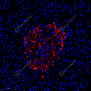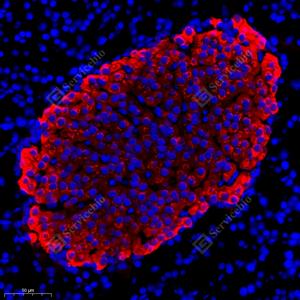 IF检测Insulin蛋白(货号 GB11334)(红色). 样品: 小鼠胰腺, 4%多聚甲醛 (货号G1101) 固定12-24小时. 抗原修复: Tris-EDTA抗原修复液(pH 9.0) (G1203), 98℃, 20分钟. 封闭: 3% BSA(货号GC305010)的PBS溶液, 室温孵育30分钟. —抗: 1: 150稀释, 4℃ 孵育过夜. 二抗: Cy3标记山羊抗兔IgG (H+L) (货号GB21303), 1: 300稀释, 室温孵育1小时. |