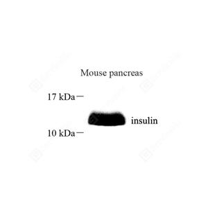WB检测Insulin蛋白(货号 GB12335). 样品: 经RIPA裂解液(货号G2002)处理的蛋白质. 封闭: 3%脱脂牛奶(货号GC310001)溶于TBST溶液, 室温孵育1小时. —抗: 1: 1000稀释, 4℃ 孵育过夜. 二抗: HRP标记山羊抗小鼠IgG (H+L) (货号GB23301), 1: 5000稀释, 室温孵育1小时. |