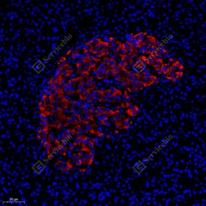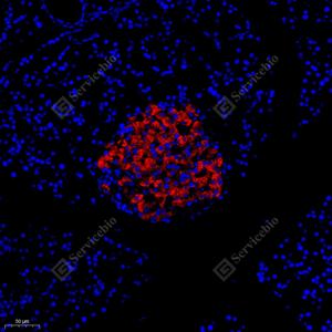 IF检测Insulin蛋白(货号 GB12335)(红色). 样品: 小鼠胰腺, 4%多聚甲醛 (货号G1101) 固定12-24小时. 抗原修复: Tris-EDTA抗原修复液(pH 9.0) (G1203), 98℃, 20分钟. 封闭: 3% BSA(货号GC305010)的PBS溶液, 室温孵育30分钟. —抗: 1: 500稀释, 4℃ 孵育过夜. 二抗: Cy3标记山羊抗小鼠IgG (H+L) (货号GB21301), 1: 300稀释, 室温孵育1小时. |