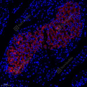 IF检测Insulin蛋白(货号 GB12335)(红色). 样品: 人胰腺, 4%多聚甲醛 (货号G1101) 固定12-24小时. 抗原修复: Tris-EDTA抗原修复液(pH 9.0) (G1203), 98℃, 20分钟. 封闭: 3% BSA(货号GC305010)的PBS溶液, 室温孵育30分钟. —抗: 1: 500稀释, 4℃ 孵育过夜. 二抗: Cy3标记山羊抗小鼠IgG (H+L) (货号GB21301), 1: 300稀释, 室温孵育1小时. |
