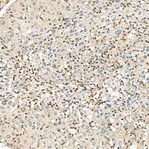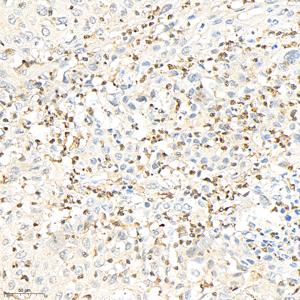 IHC检测p38蛋白(货号 GB154685). 样品: 人宫颈癌, 4%多聚甲醛 (货号G1101) 固定12-24小时. 抗原修复: 柠檬酸抗原修复液(干粉, pH 6.0) (G1201), 高压锅均匀喷气计时2分钟. —抗: 1: 1000稀释, 4℃ 孵育过夜. 二抗: HRP标记山羊抗兔IgG (H+L) (货号GB23303), 1: 200稀释, 室温孵育1小时. |