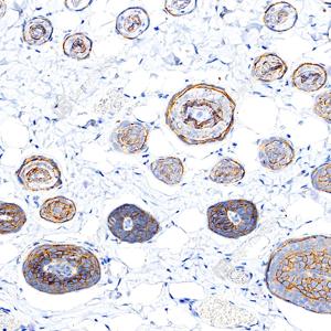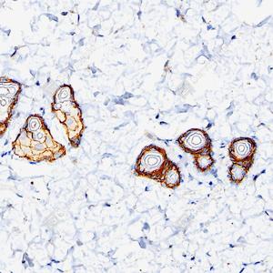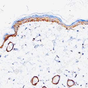 | IHC检测EGFR蛋白(货号 GB150132). 样品: 大鼠皮肤, 4%多聚甲醛 (货号G1101) 固定12-24小时. 抗原修复: 抗原修复仪 (货号 ARI-4),Tris-EDTA抗原修复液(pH 9.0) (货号G1203), 水浴100℃, 25分钟. —抗: 1: 600稀释, 4℃ 孵育过夜. 二抗: S-vision免疫组化多聚二抗(山羊抗兔),即用型 (货号G1302), 室温孵育20分钟. |