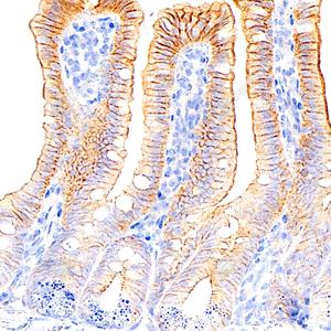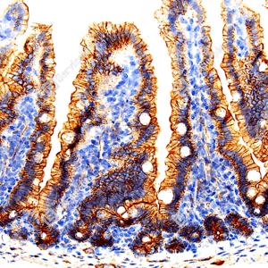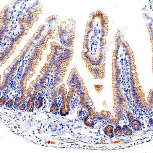 | IHC检测EGFR蛋白(货号 GB150132). 样品: 大鼠小肠, 4%多聚甲醛 (货号G1101) 固定12-24小时. 抗原修复: 抗原修复仪 (货号 ARI-4),Tris-EDTA抗原修复液(pH 9.0) (货号G1203), 水浴100℃, 25分钟. —抗: 1: 600稀释, 4℃ 孵育过夜. 二抗: S-vision免疫组化多聚二抗(山羊抗兔),即用型 (货号G1302), 室温孵育20分钟. |