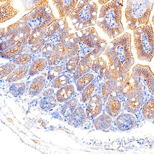| IHC检测EGFR蛋白(货号 GB150132). 样品: 小鼠小肠, 4%多聚甲醛 (货号G1101) 固定12-24小时. 抗原修复: 抗原修复仪 (货号 ARI-4),Tris-EDTA抗原修复液(pH 9.0) (货号G1203), 水浴100℃, 25分钟. —抗: 1: 1000稀释, 4℃ 孵育过夜. 二抗: S-vision免疫组化多聚二抗(山羊抗兔),即用型 (货号G1302), 室温孵育20分钟. |
